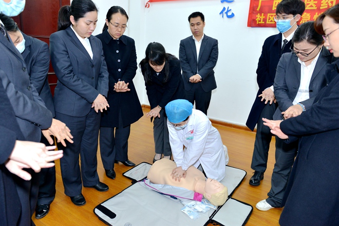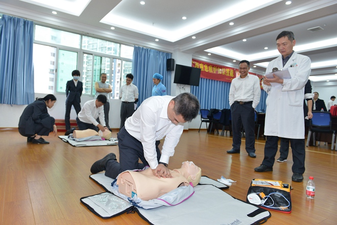 瑞康醫(yī)院副主任醫(yī)師黃清玉、龔斌為大家講授應(yīng)急救治的理論知識(shí)。他們通過(guò)多個(gè)生動(dòng)的案例突出救命的黃金時(shí)間重要性,強(qiáng)調(diào)突發(fā)事件現(xiàn)場(chǎng)第一目擊者(第一反應(yīng)人)為傷病員提供心肺復(fù)蘇操作的必要性,傳播“人人學(xué)急救、急救為人人”的理念。他們以通俗易懂的方式深入淺出地講解了應(yīng)急救護(hù)理論知識(shí)、高質(zhì)量心肺復(fù)蘇(CPR)、自動(dòng)體外心臟除顫器(AED)的使用、氣道異物梗阻的處理方法,告訴學(xué)員們更好地解決“何時(shí)救、誰(shuí)來(lái)救、怎么救”的問(wèn)題,培養(yǎng)學(xué)員既要有見(jiàn)義勇為的意識(shí),更要具有見(jiàn)義智為的知識(shí)和技能。