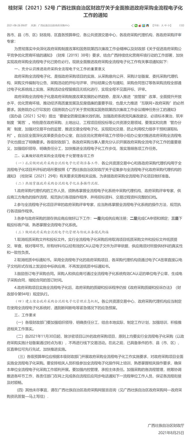 附:《廣西壯族自治區(qū)財(cái)政廳關(guān)于全面推進(jìn)政府采購(gòu)全流程電子化工作的通知》(桂財(cái)采〔2021〕52號(hào) )