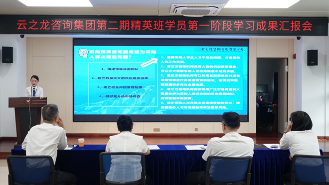 2022年5月23日,云之龍咨詢集團(tuán)人力資源部組織第二期精英班學(xué)員開展入職第一階段學(xué)習(xí)成果匯報會。集團(tuán)總裁王鐿霖,副總裁韋明劍、韓俊以及集團(tuán)人力資源部總經(jīng)理秦譽(yù)珊作為評委出席會議。