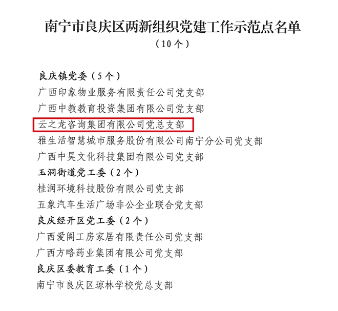 近日,中共南寧市良慶區(qū)委員會(huì)組織部、中共南寧市良慶區(qū)非公有制經(jīng)濟(jì)組織和社會(huì)組織工作委員會(huì)聯(lián)合發(fā)布了《關(guān)于公布南寧市良慶區(qū)兩新組織黨建工作示范點(diǎn)名單的通知》。云之龍黨總支部名列其中,榮獲“南寧市良慶區(qū)兩新組織黨建示范點(diǎn)”稱號(hào)。
