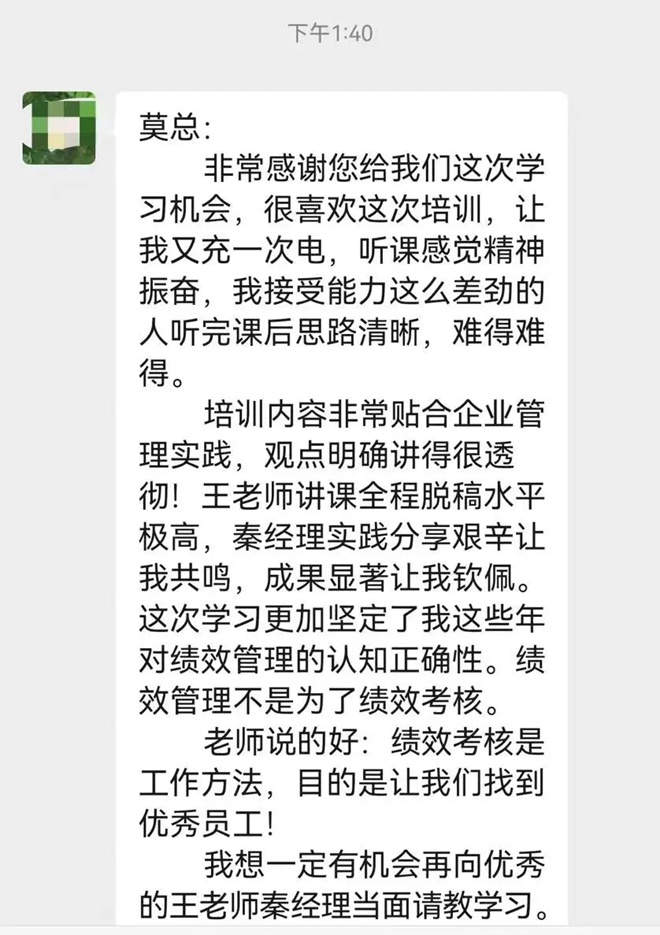 活動結(jié)束后,與會嘉賓紛紛表達分享會的感激之情。一位來自知名企業(yè)的中層管理人員表示:“王老師和秦總的分享非常實用,讓我對績效管理有了更深刻的理解。未來,也希望我們公司能有機會與王伯巖老師的團隊加強交流與合作,將績效管理更深入地運用到企業(yè)管理中,實現(xiàn)管理落地,推動企業(yè)向現(xiàn)代化、高質(zhì)量發(fā)展?!?