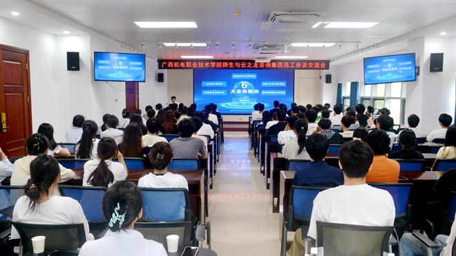 2025年5月8日,廣西機(jī)電職業(yè)技術(shù)學(xué)院工程造價專業(yè)近百名師生走進(jìn)云之龍咨詢集團(tuán),開啟了一場別開生面的職業(yè)探索之旅。校企雙方以"理論+實(shí)踐"為紐帶,通過沉浸式參觀、行業(yè)大咖分享、互動研討等環(huán)節(jié),為青年學(xué)子搭建起從課堂到職場的"成長階梯"。