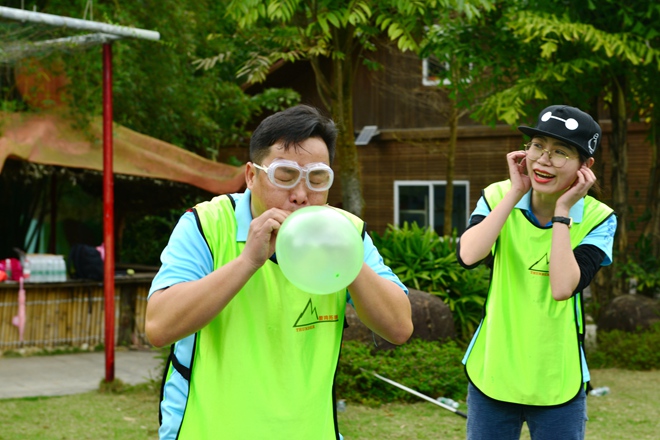 在接力障礙賽環(huán)節(jié)中,團(tuán)隊(duì)分成兩組,在擠壓板上完成雙人跳繩、跳馬、吹爆氣球等一系列熔煉團(tuán)隊(duì)精神的游戲。在游戲中,大家相互配合、攜手合作,在成功時(shí)歡呼喝彩,在遇到困難時(shí)集思廣益。